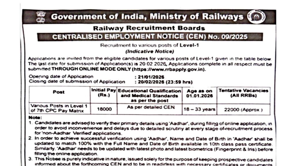 रेलवे ग्रुप डी भर्ती 2026 में शामिल युवाओं के लिए महत्वपूर्ण अपडेट है। ग्रुप डी लेवल 1 के 22 हजार रिक्तियों के लिए आवेदन प्रक्रिया 21 जनवरी से टेरर की जेनरी थी जिसे अब जारी किया गया है। रेलवे रिक्रूटमेंट बोर्ड (आरआरबी) की ओर से जारी संशोधित नोटिफिकेशन के अनुसार अब इस भर्ती के लिए आवेदन प्रक्रिया 31 जनवरी से शुरू होगी। फॉर्म जमा करने की आखिरी तारीख 2 मार्च 2026 तय की गई है।